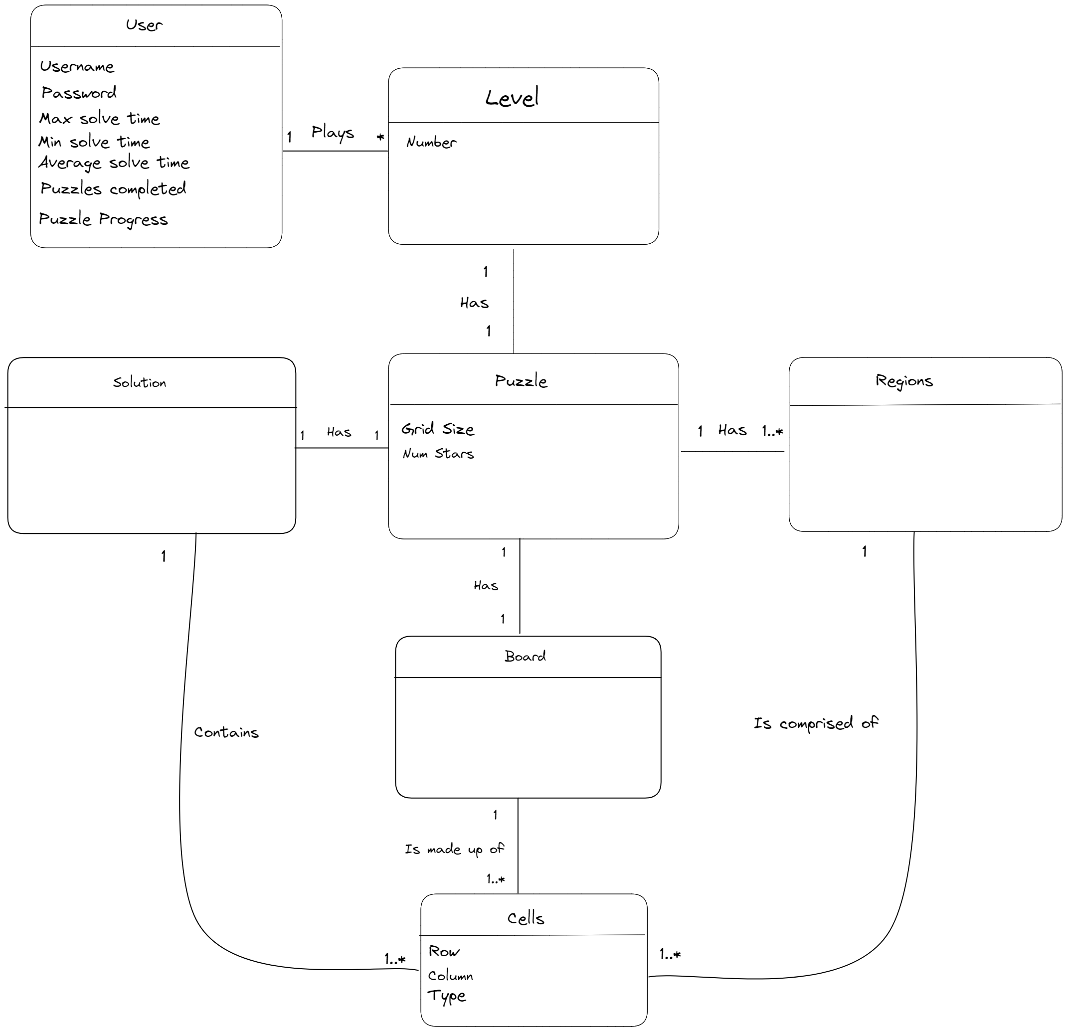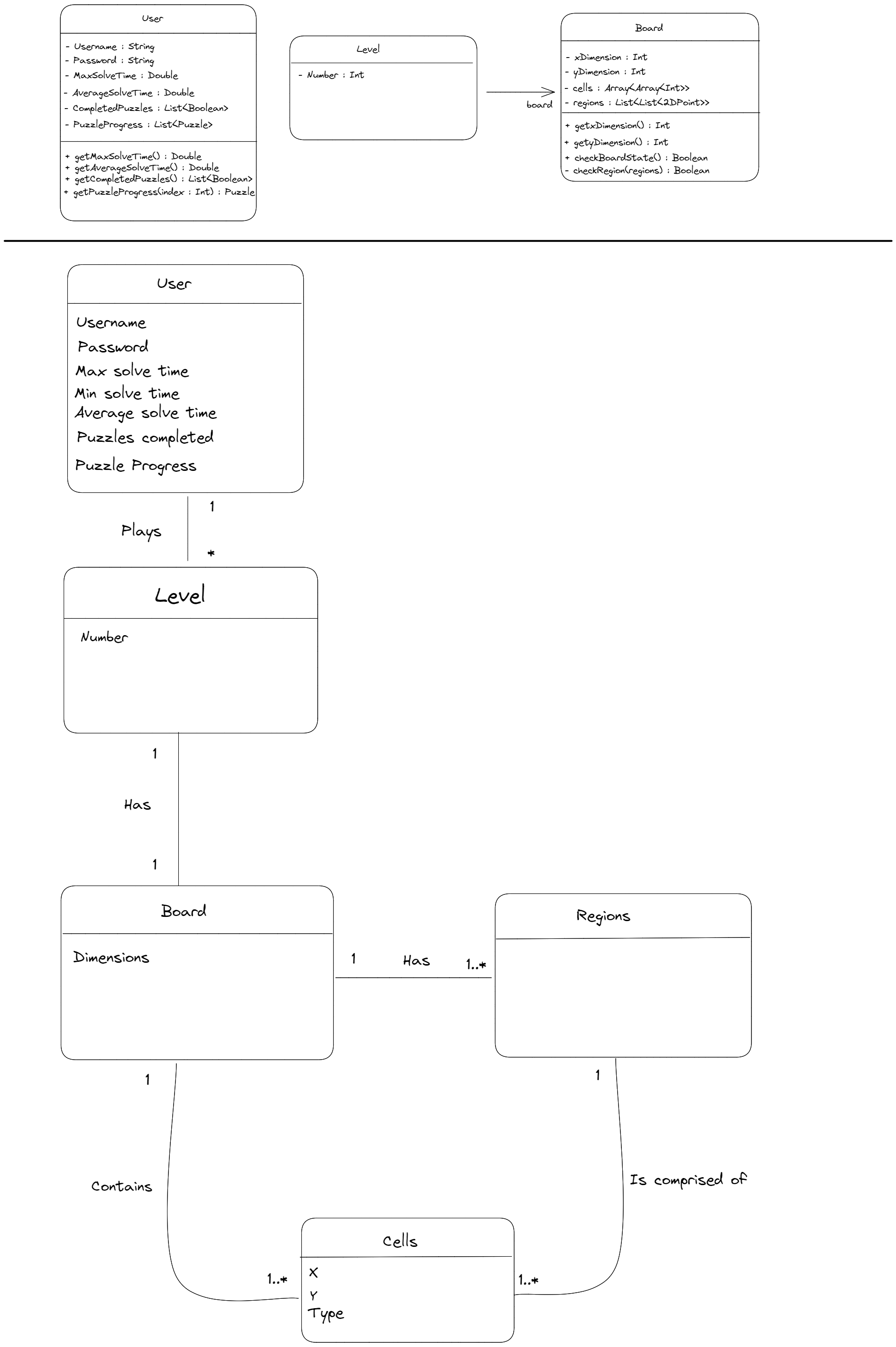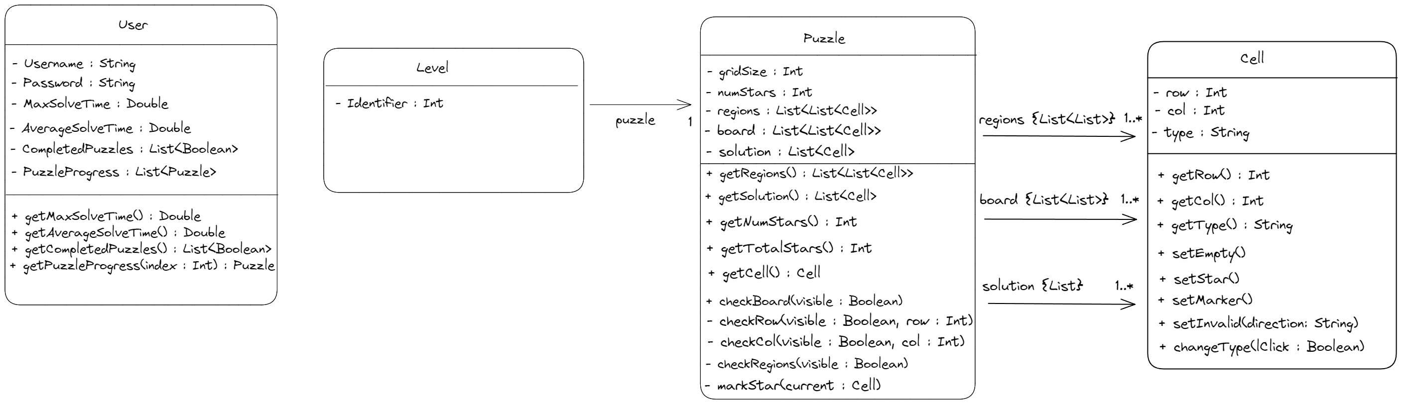 I played around with creating a very rough draft class diagram (top) as well as updating the domain model a little. I want some feedback before I commit to anything official. I'm still struggling with what Wolff put in feedback about abstracting the puzzle object and how to represent puzzles in progress. Currently, I'm thinking that puzzle progress will be stored per user as a Level type object? Essentially storing their board state? It doesn't feel quite right. Other than that, actually representing the board is kinda being weird to me. I think its helpful conceptually to think about the Board being made up of several cells, but on a practical level, its much easier to have the Board be a simple 2D array, with the cells just being X, Y pairs in that array, which is what I have tried to model in the class diagram.