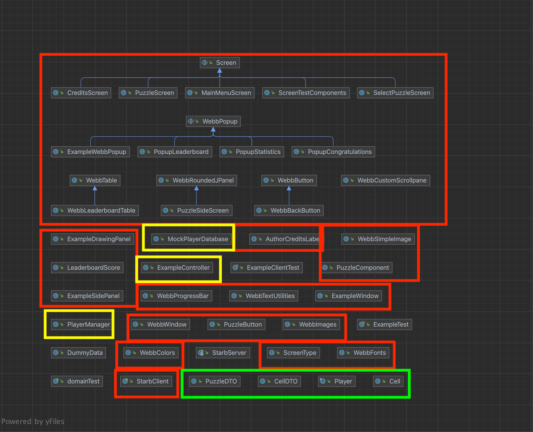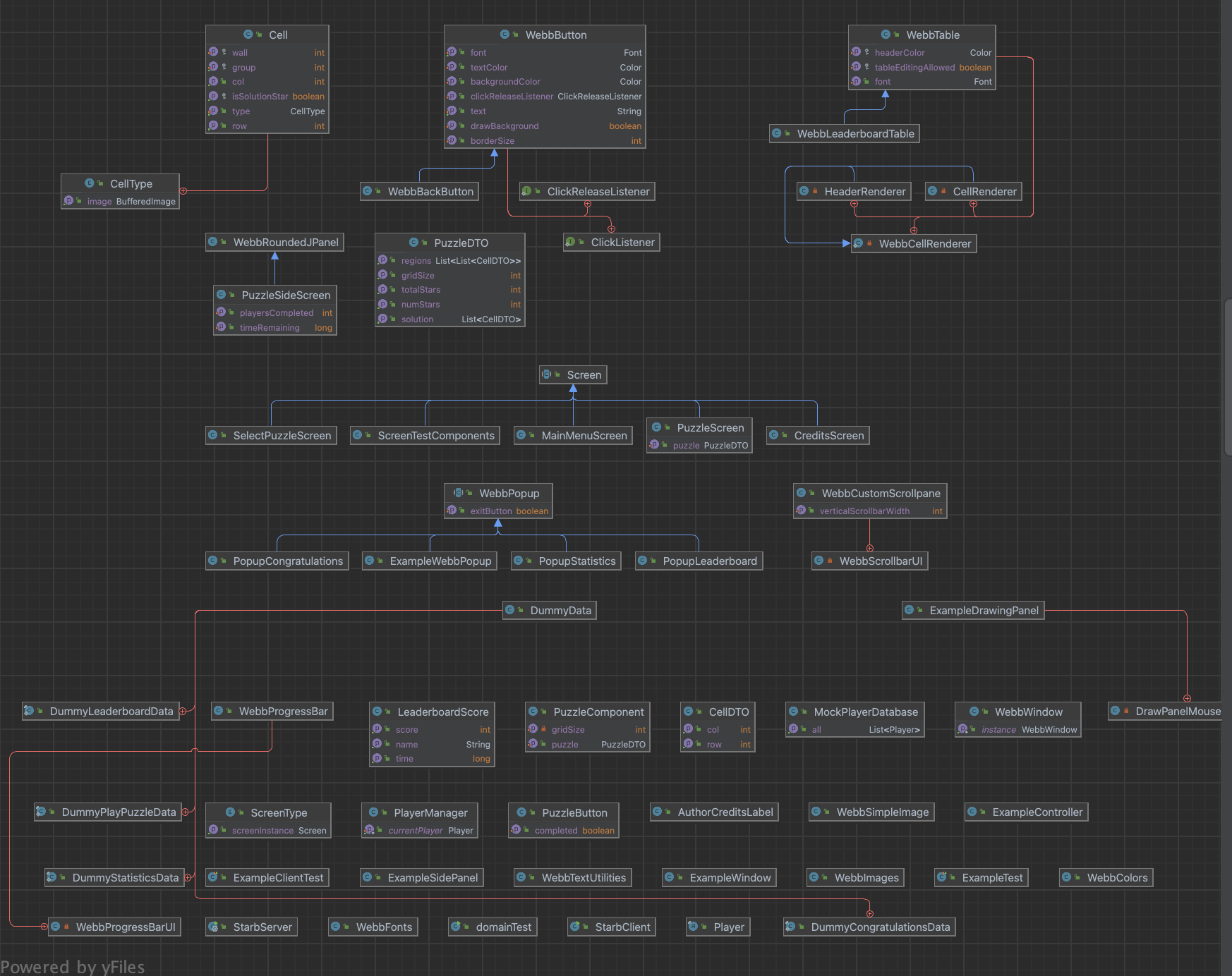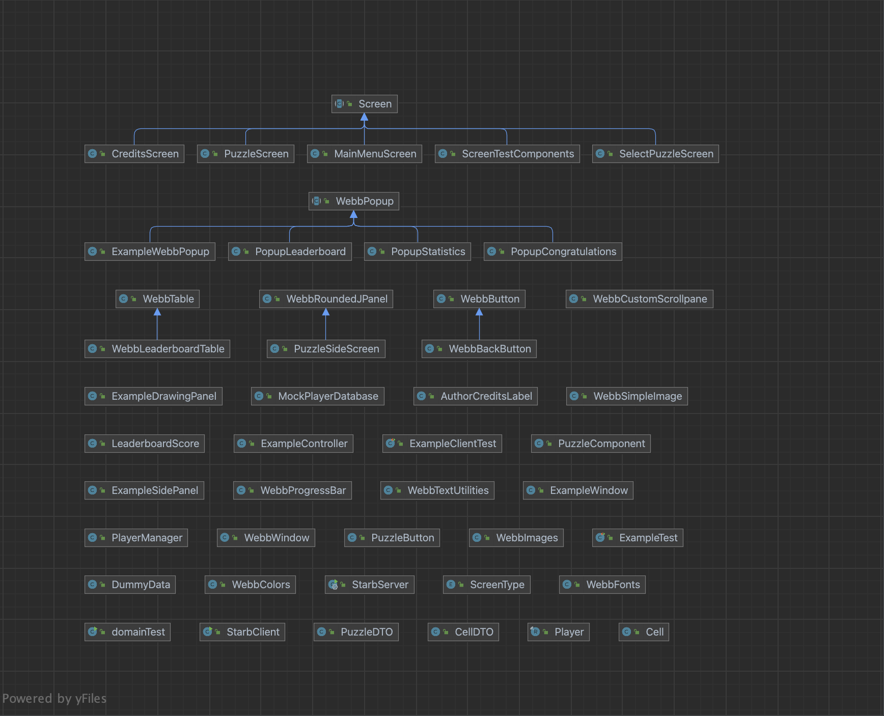 UI Package: contains screens, popups, and most general webb components (swing-based components tailored to our game)